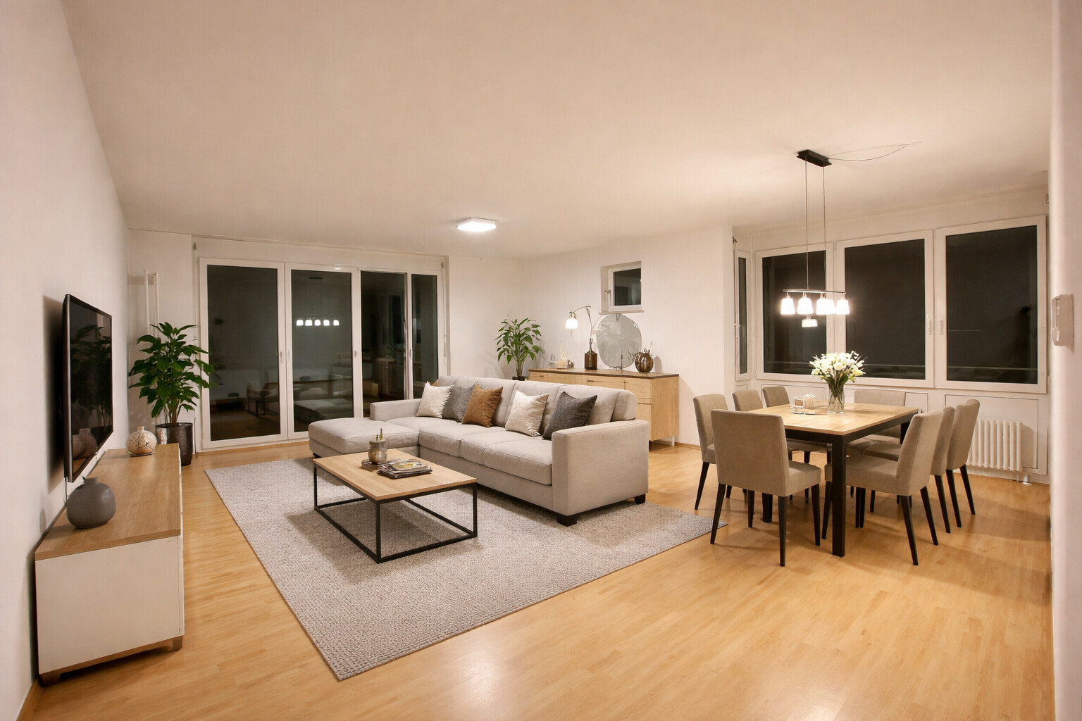 Der großzügige Wohnbereich bildet den Mittelpunkt der Wohnung und überzeugt durch seine helle, freundliche Atmosphäre. Von hier aus gelangt man auf den Balkon, der den Wohnraum nach außen erweitert und Platz für entspannte Stunden bietet.