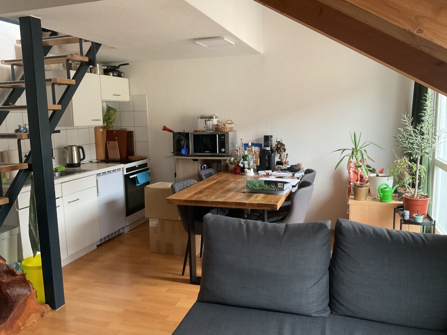 Das Highlight der Wohnung ist, dass der Wohnbereich, die offene Galerie, als auch das Schlafzimmer durch die sichtbaren Holzbalken eine gemütliche Atmosphäre erschafft. Die Dachschrägen verleihen dem Raum einen einzigartigen Charakter und machen ihn besonders heimelig. Der Wohnbereich geht fließend in die gut ausgestattete Küche über, die Platz für eine gemütliche Essecke bietet.