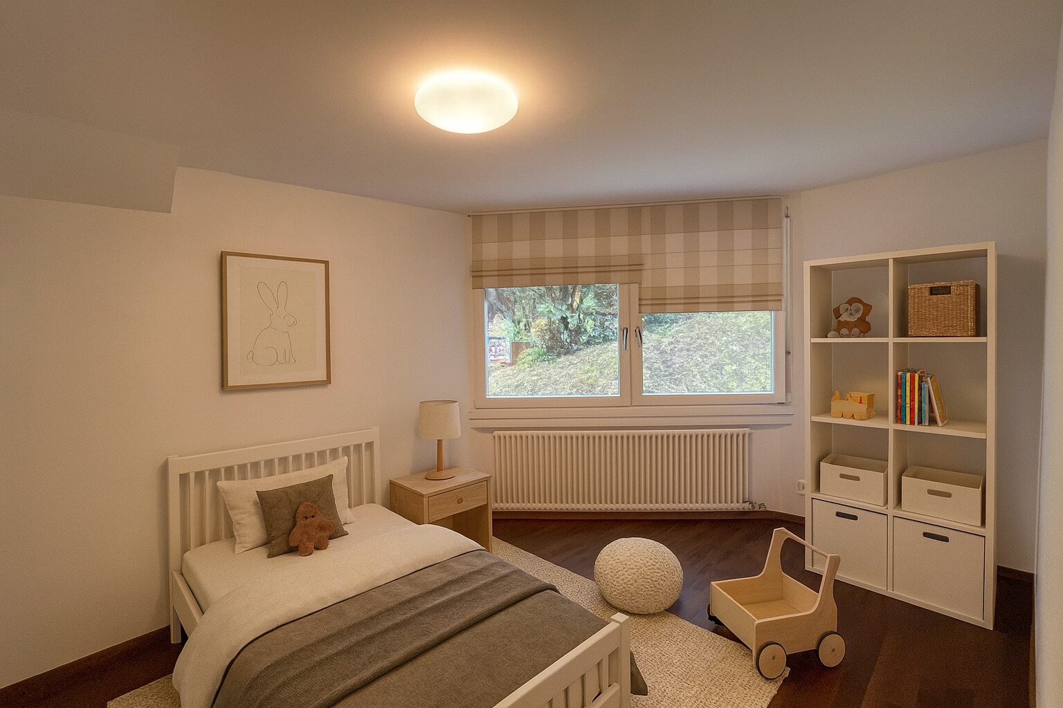 Das Raumkonzept ist ideal für Familien: Das Elternschlafzimmer verfügt über ein eigenes Badezimmer mit Badewanne und bodengleicher Dusche. Für das Kinderzimmer steht ein separates Duschbad zur Verfügung. Ein zusätzliches Gäste-WC sorgt für weiteren Komfort.